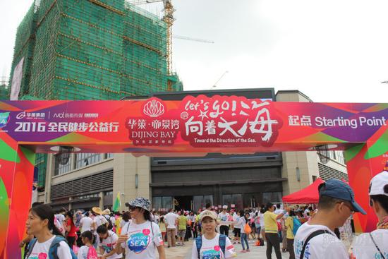 在9:30左右,活動(dòng)舉行簡(jiǎn)單的授旗儀式,由健美操隊(duì)員在臺(tái)上帶領(lǐng)活動(dòng)參與者做熱身運(yùn)動(dòng)。在主持人邀請(qǐng)了華策、南都、政府等13位領(lǐng)導(dǎo)及嘉賓上臺(tái)進(jìn)行啟航推桿,隨后大聲宣布“華策·帝景灣特約2016全民健步公益行”正式開始,上千人跟著領(lǐng)跑歡快地跑出廣場(chǎng),進(jìn)行今天6公里的愛心旅程。路徑途徑白埔路,經(jīng)情侶北路穿越濱海半島,再折回原點(diǎn)。