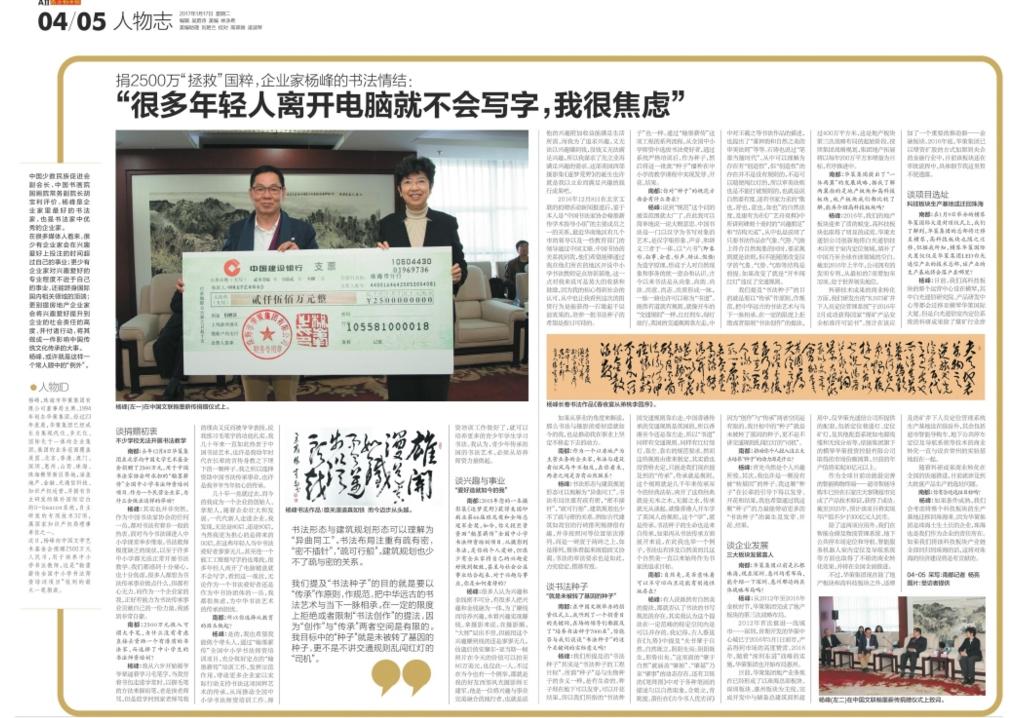 近日,楊峰向中國文學藝術基金會捐贈2500萬元人民幣,用于培養中小學書法教師,這是“翰墨薪傳全國中小學書法師資培訓項目”收到的最大一筆捐款。