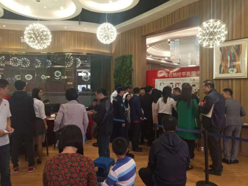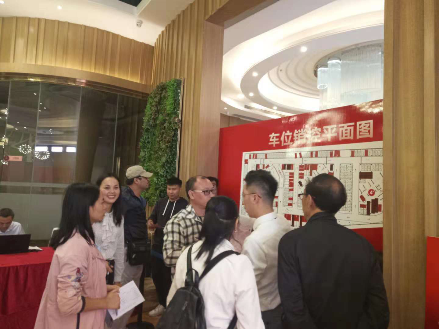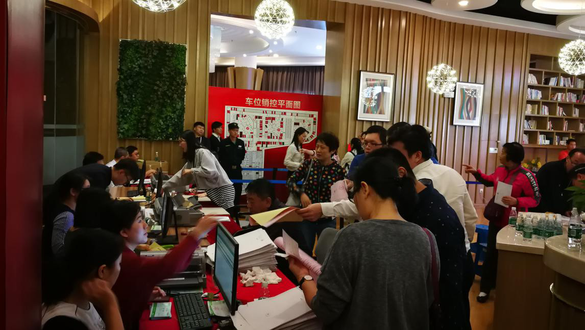 現場,一組一組的業主陸續進入選車位區,迅速搶定車位,把銷控區、財務區擠得水泄不通。工作人員忙得不可開交,不到兩個小時,車位銷控板迅速飚紅。