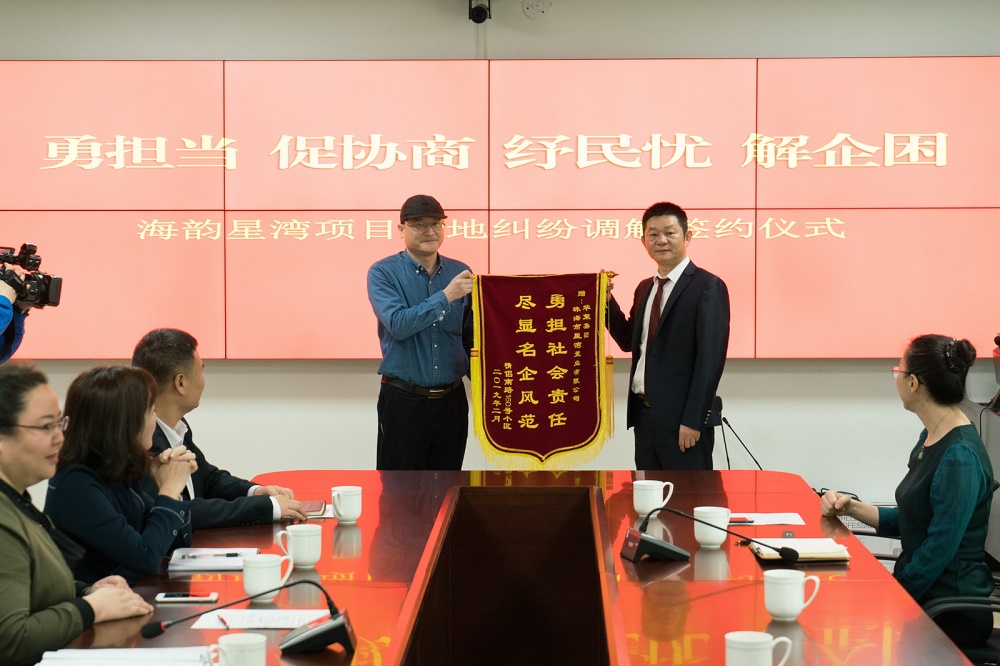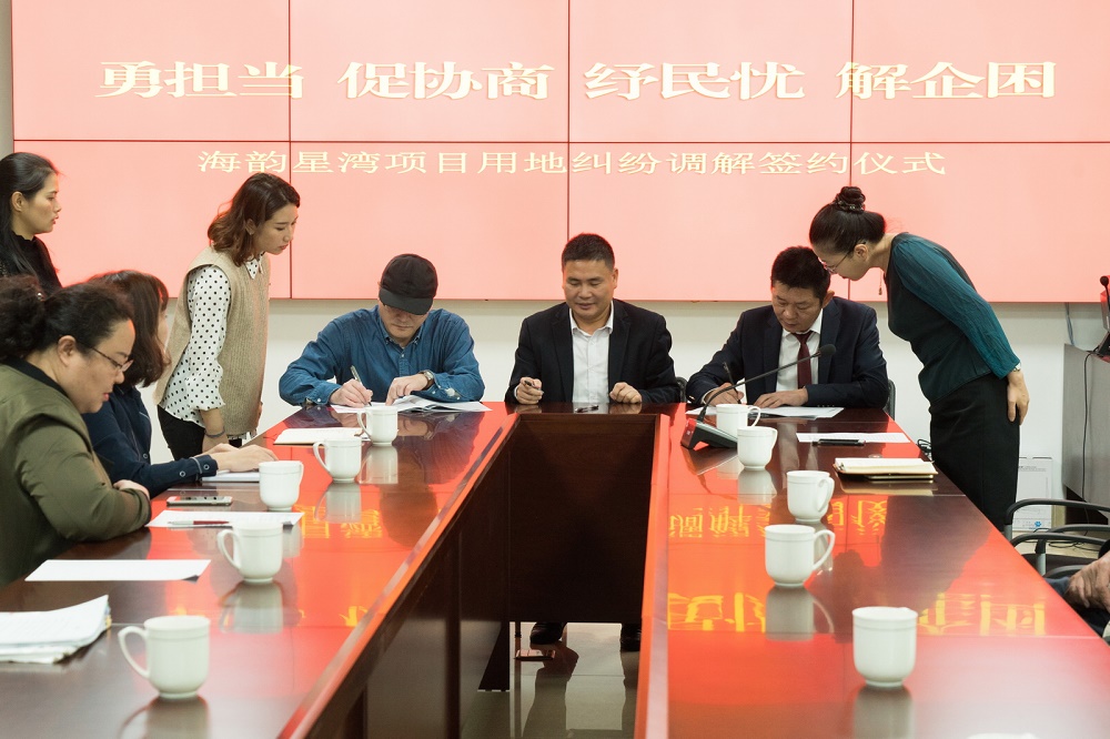 2月22日,海韻星灣項目用地糾紛調(diào)解簽約儀式在珠海市香洲區(qū)吉大街道辦事處舉行。華策集團董事副總裁姚政、華策集團珠海星灣置業(yè)有限公司總經(jīng)理高杰、珠海市香洲區(qū)吉大街道黨工委副書記鐘國灼、珠海市香洲區(qū)吉大街道辦事處主任馮風梅以及情侶南路160號小區(qū)業(yè)主代表參加了此次簽約儀式。