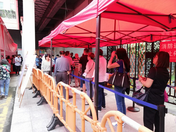 上午9點,簽到區已排長隊,在工作人員的指引下,陸續到來的業主有序地進行簽到。簽到人員認真審核業主資料,并派發臂貼號。