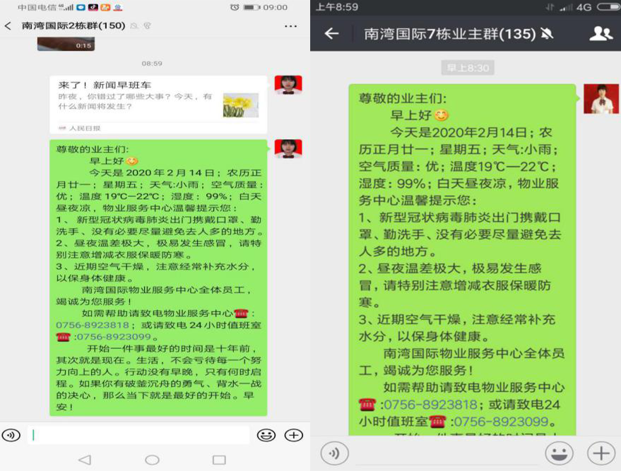 非常時期,健康人居成為每一個人安身立命之本,與疫情作戰(zhàn)就是在與時間賽跑。1月23日,大年二十九,“武漢封城”的信息傳來,自稱“小女生”的南灣國際公館物業(yè)項(xiàng)目副經(jīng)理王萍萍看著不斷被疫情刷新的微信群信息,心頭一緊,在收到疫情防控的工作要求后更是心慌意亂,不知如何是好,著急得哭了起來。過了一會,王萍萍想了想,小區(qū)7棟居民樓的共計(jì)1485多居民的健康可不是小事,作為春節(jié)期間的物業(yè)負(fù)責(zé)人,在物業(yè)其他領(lǐng)導(dǎo)因疫情防控,暫時不能回來的情況下,必須獨(dú)自撐起來。