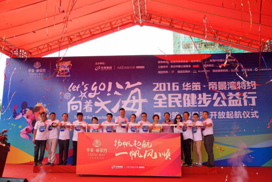 隨后華策集團領導、南都媒體等13位到場貴賓進行啟航推桿儀式,2016華策·帝景灣特約“全民健步公益行”活動正式拉開帷幕,上千人跟著領跑歡快的跑出廣場,開始了6公里的愛心旅程。